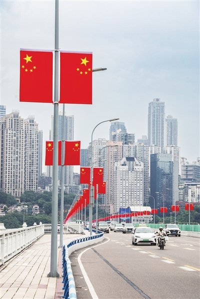 9月25日,连接渝中、江北的黄花园大桥上,鲜艳的五星红旗迎风飘扬。