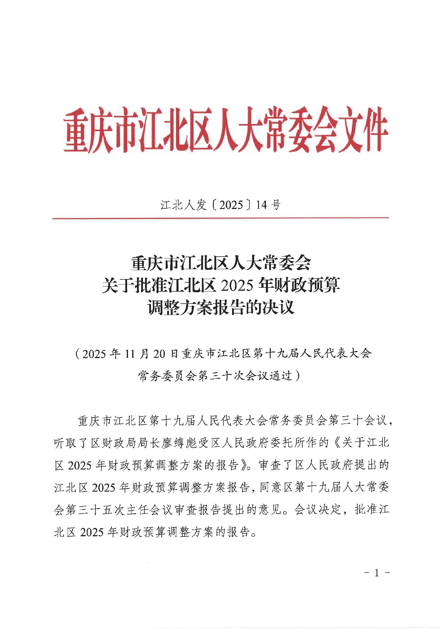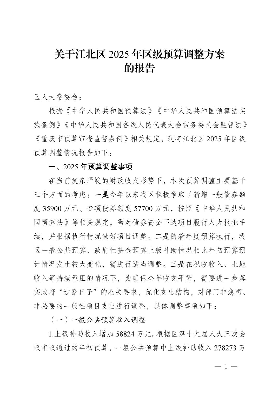 关于江北区2025年区级预算调整方案的报告
