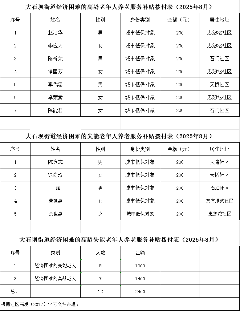 大石坝街道2025年8月经济困难的高龄和失能老年人养老服务补贴拨付表