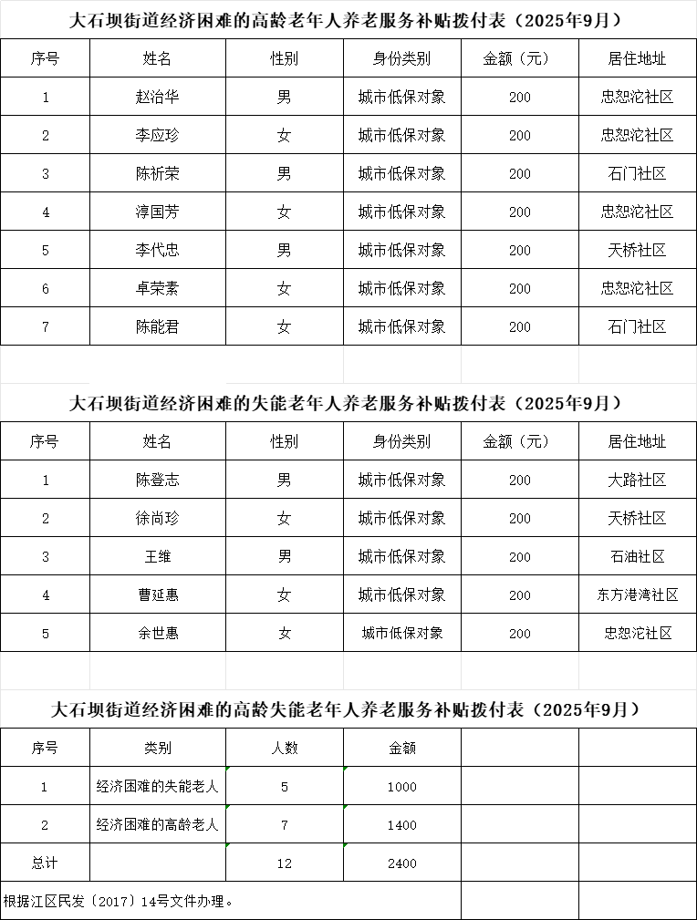 大石坝街道2025年9月经济困难的高龄和失能老年人养老服务补贴拨付表