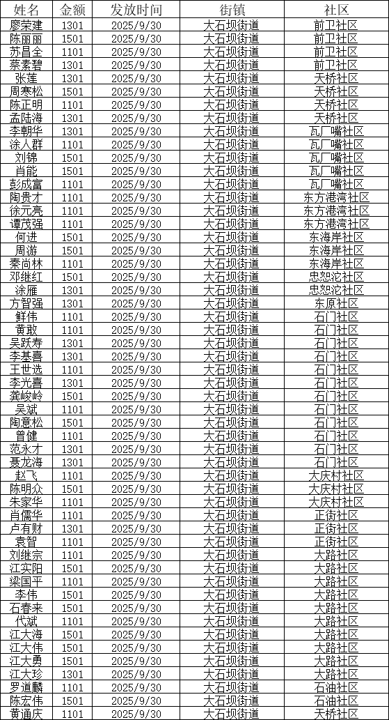 江北区大石坝街道2025年9月特困对象相关信息