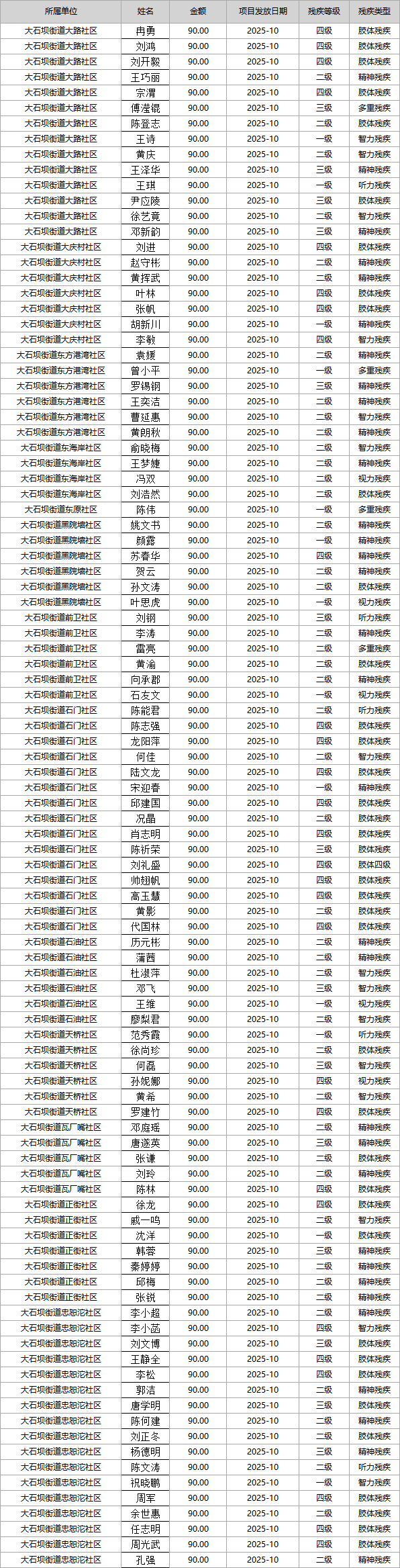 江北区大石坝街道2025年10月困难残疾人两补相关信息