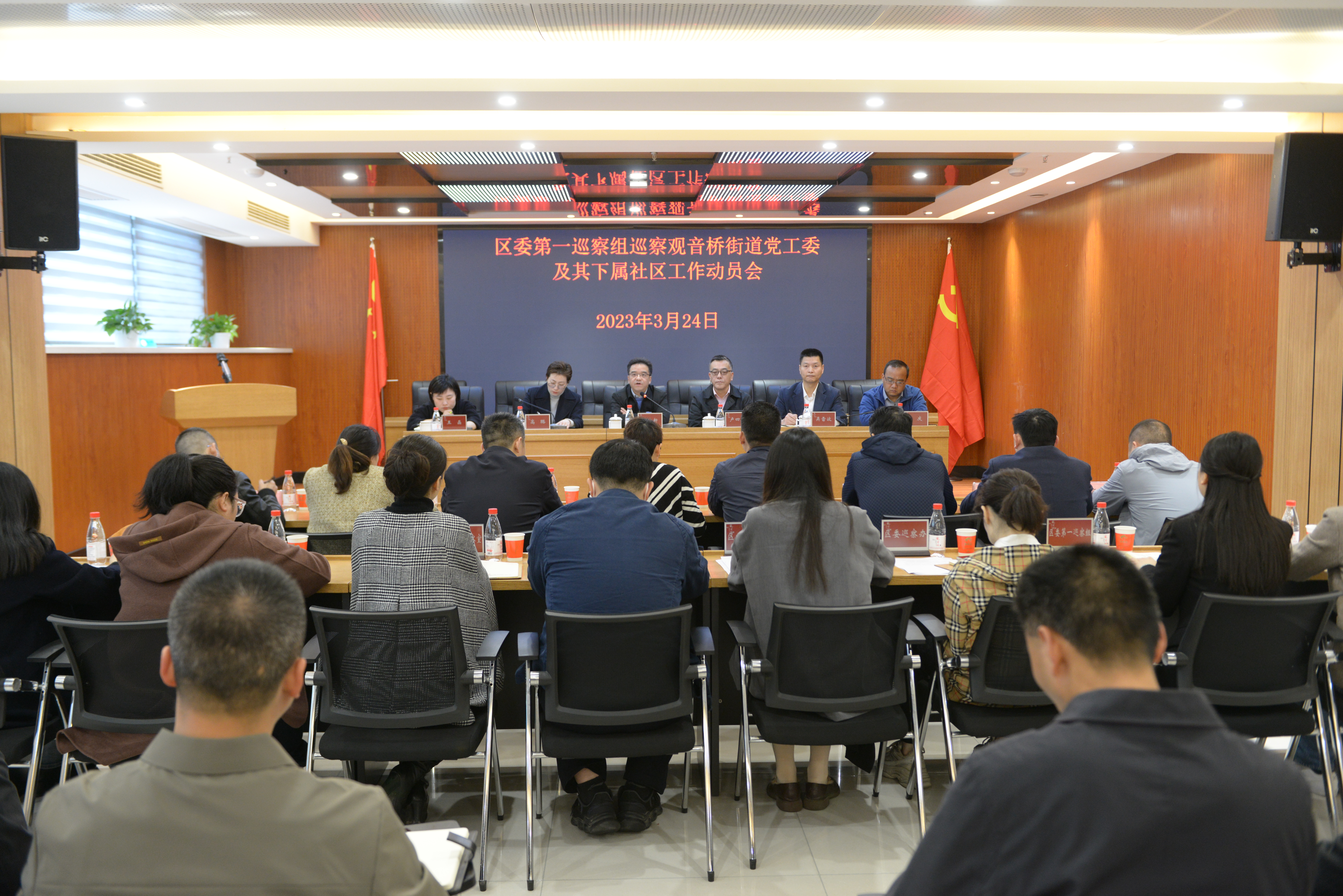 根据区委关于巡察工作的统一安排,2023年3月24日上午,区委第一巡察组巡察观音桥街道党工委及其下属社区工作动员会召开。会前召开了与观音桥街道党工委主要负责人的见面沟通会,区委常委、区纪委书记、区委巡察工作领导小组常务副组长杨新传达了中央、市委和区委有关巡视巡察工作的新部署新要求,并就开展好巡察工作提出要求,区委第一巡察组组长卢四维通报巡察任务、工作安排和总体要求,观音桥街道党工委书记高璐主持会议并作表态发言,建东社区党委书记胡渝代表观音桥街道下属社区作表态发言。