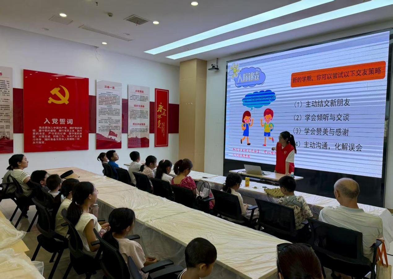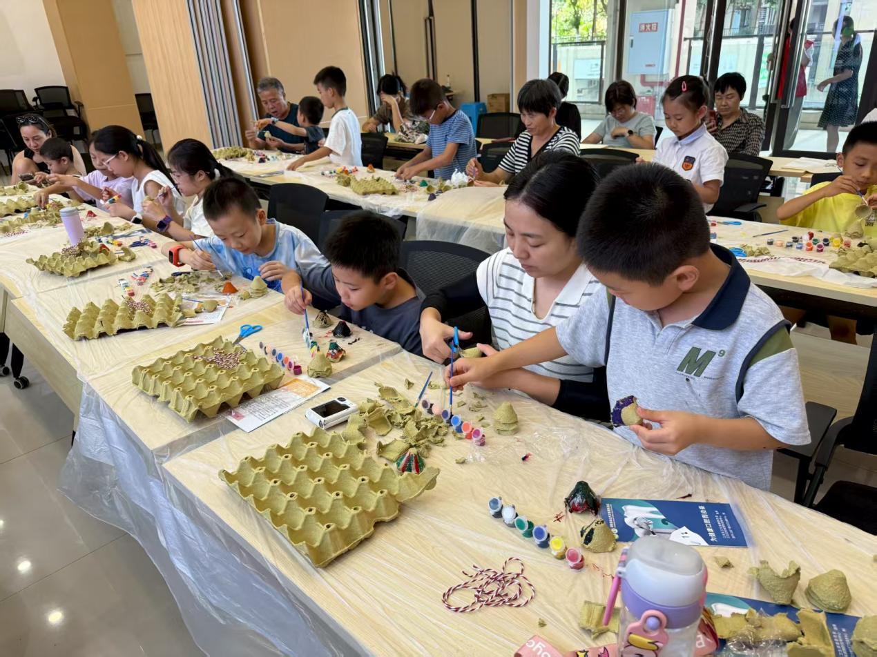 活动现场心理咨询师以轻松的提问打开话匣。通过“情绪小卡片”游戏,家长和孩子分别写下对开学的担忧与期待,一张张卡片被贴在黑板上,成了亲子间坦诚交流的起点。咨询师引导大家用“换个角度想”的方式化解焦虑。心理疏导后,志愿者老师指导大家用废旧鸡蛋托制作风铃,边讲边示范剪裁、上色、穿绳的步骤。