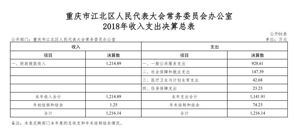 本部门2018年度收入总计1216.14万元,支出总计1216.14万元。与2017年决算数相比,收支增加63.35万元、增加5.49%,主要原因是人员经费政策性资金增加支出。