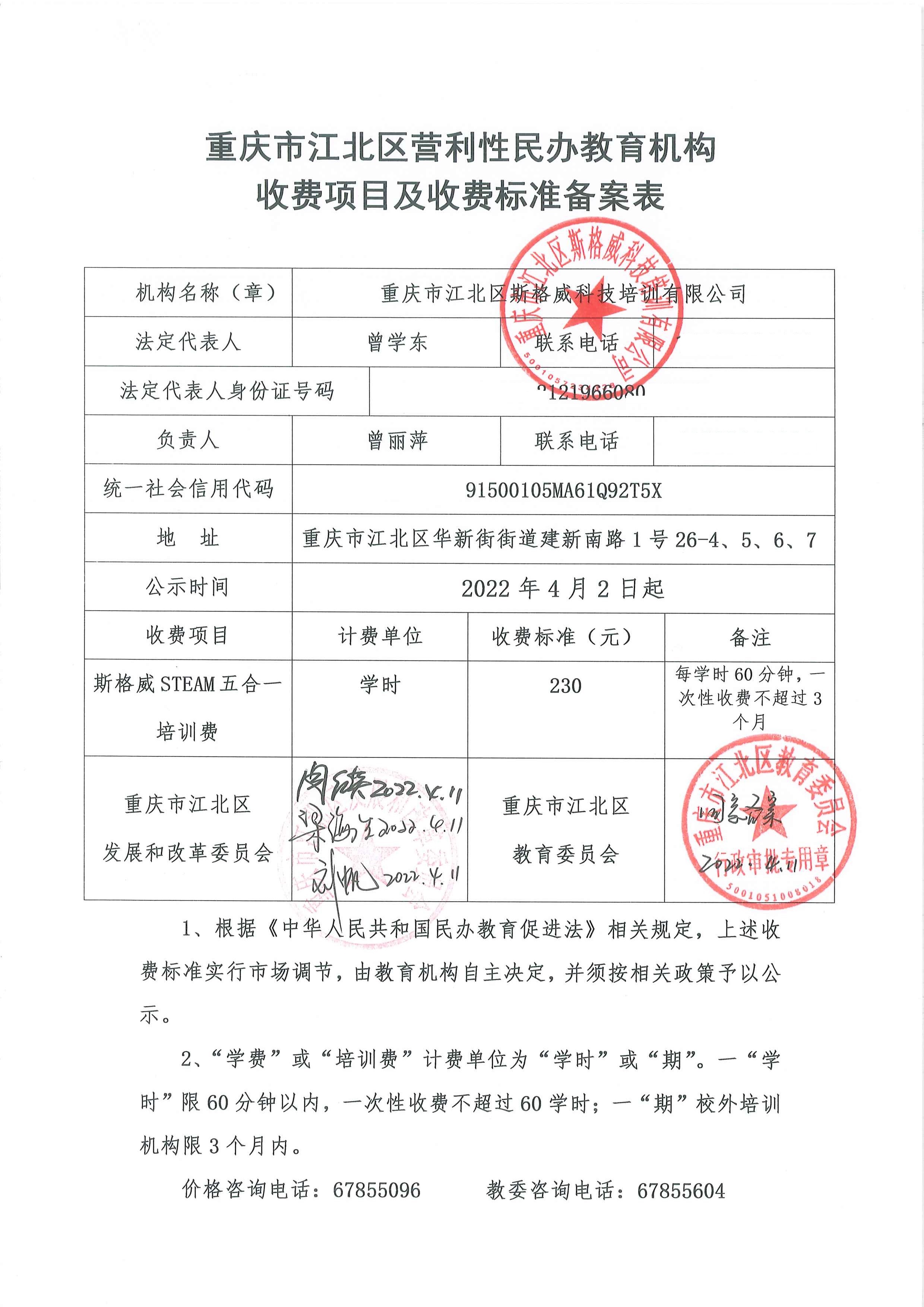 重庆市江北区斯格威科技培训有限公司收费项目及收费标准备案表