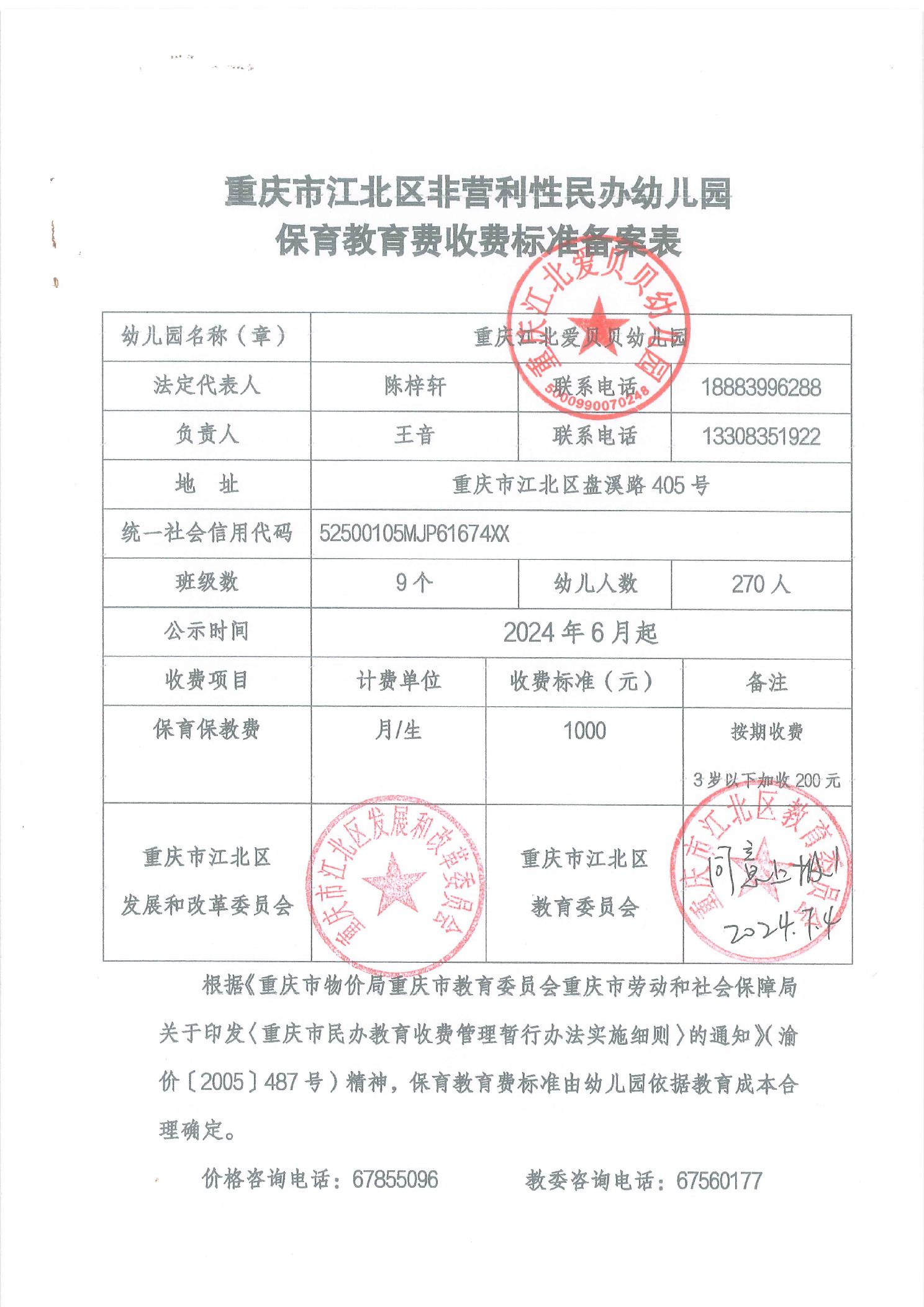 重庆江北爱贝贝幼儿园保育教育费收费标准备案表