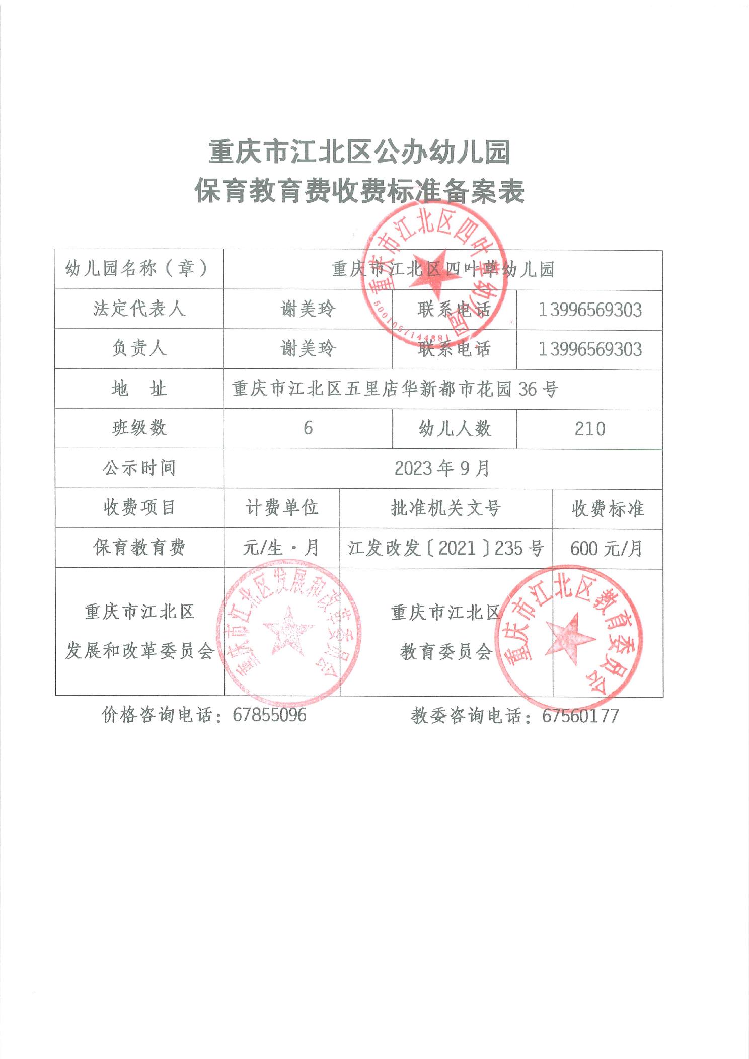 重庆市江北区四叶草乐都幼儿园保育保教费收费标准备案表
