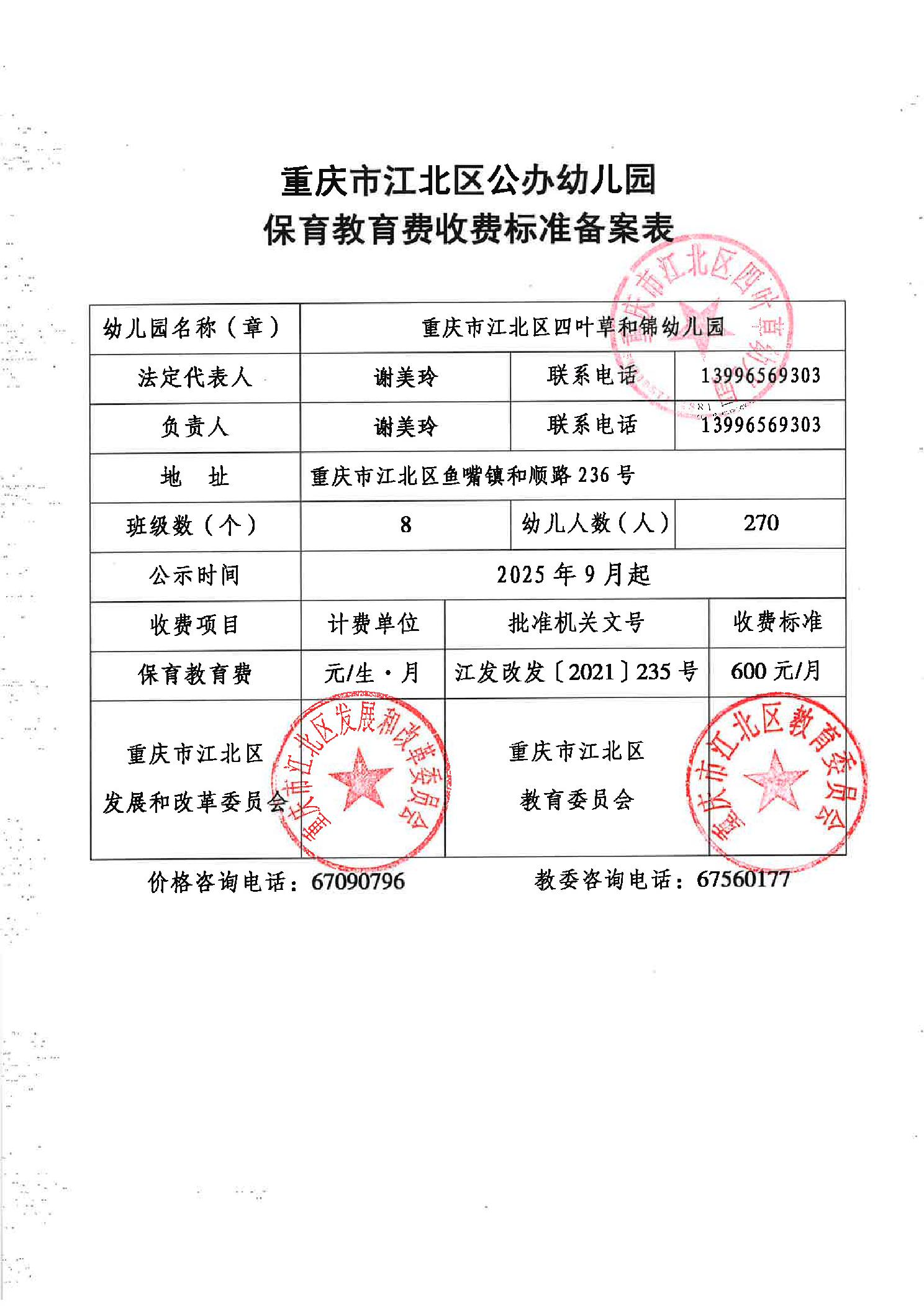 重庆市江北区四叶草和锦幼儿园保育教育费收费标准备案表