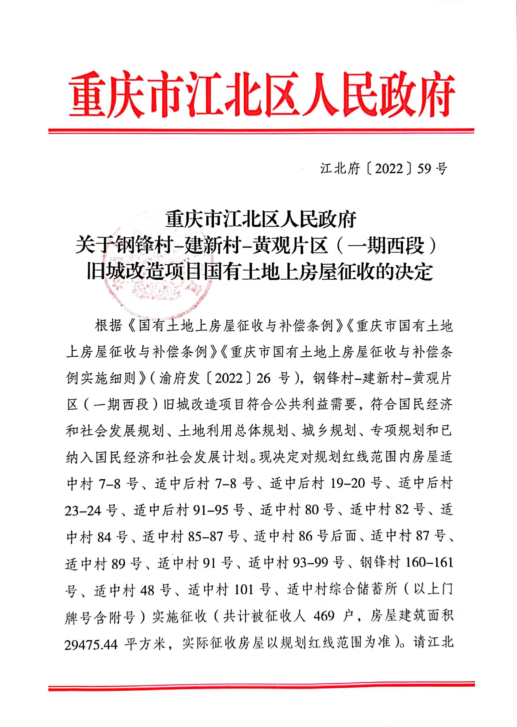 重庆市江北区人民政府关于钢锋村-建新村-黄观片区(一期西段)旧城改造项目国有土地上房屋征收的决定