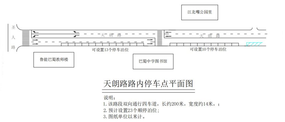为治理城市道路停车乱现象,规范路内停车秩序。根据《重庆市停车场管理办法》相关规定,江北区城市管理局会同江北区公安分局交巡警支队、寸滩街街道办事处,结合当地交通状况、周边停车场情况等综合因素,拟在天朗路设置路内停车泊位。